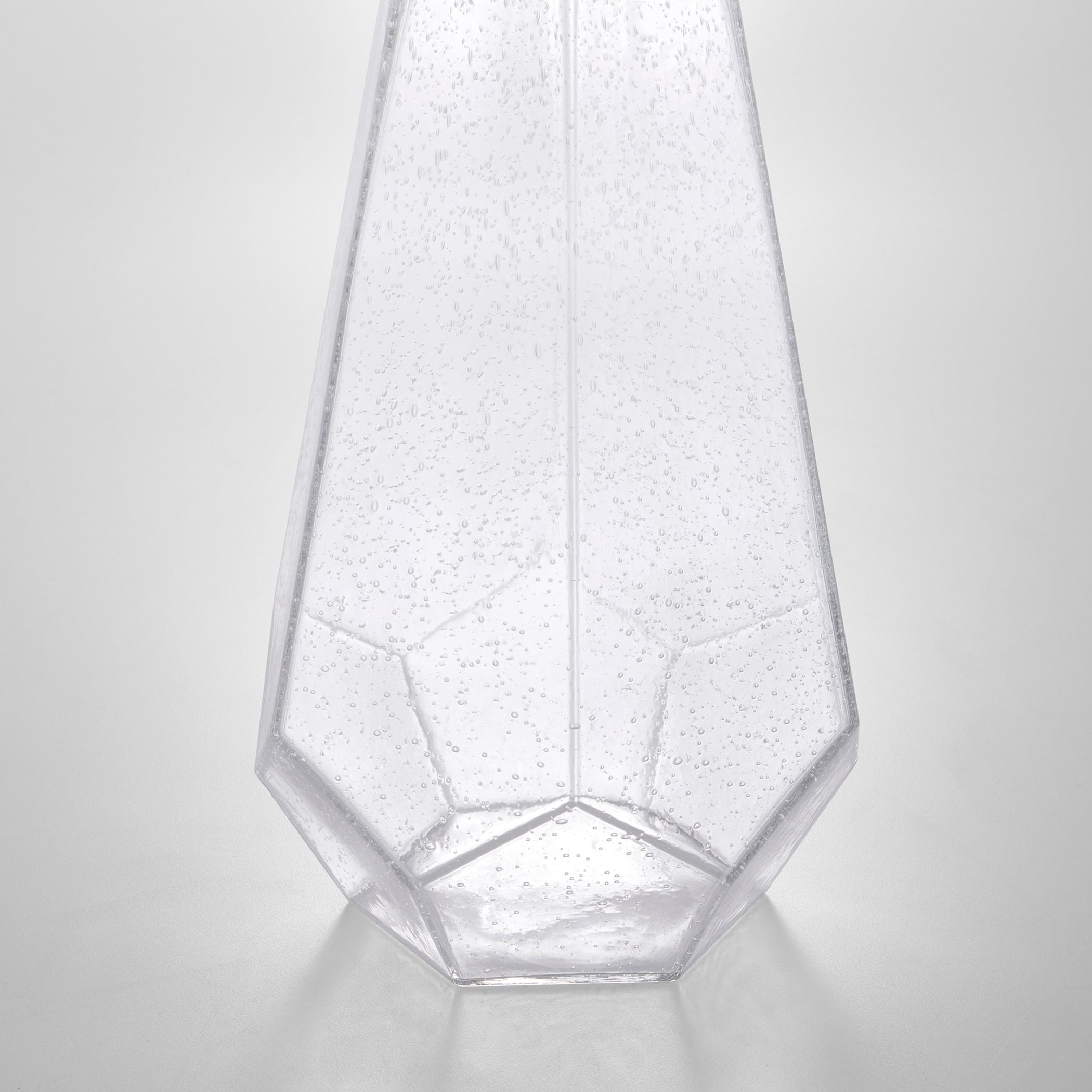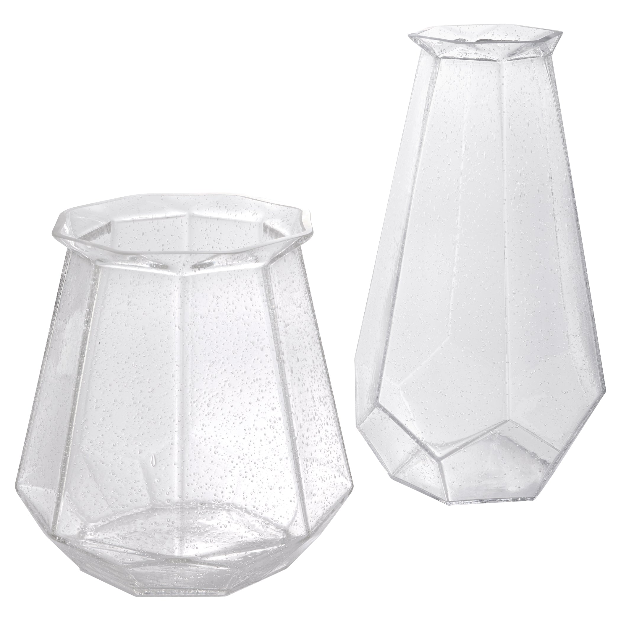 The Jager Vases showcase an elegant faceted design with a large, generous scale. The seeded glass texture adds depth and visual intrigue to the stunning piece.